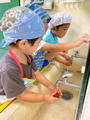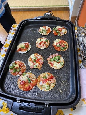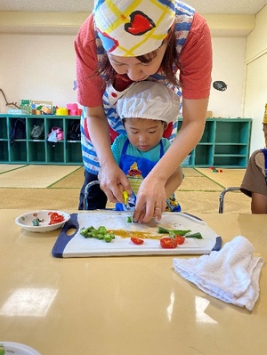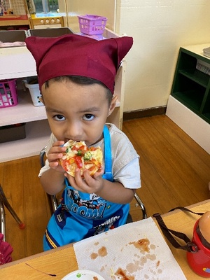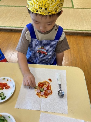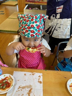 令和7年8月6日(水) いるか組さん食育のひとつとして、自分たちで収穫したピーマン・トマト・オクラを使って手作りピザをつくりました。みんなで一緒に食べて美味しかったです。