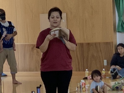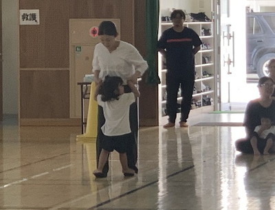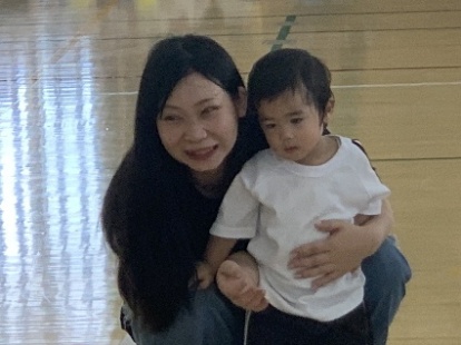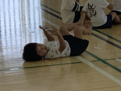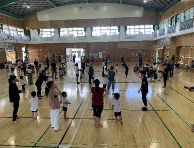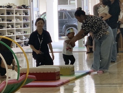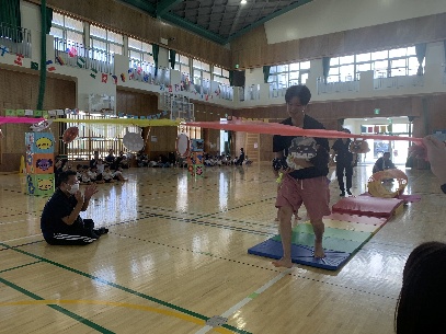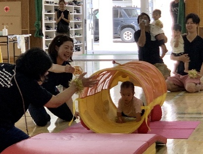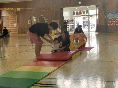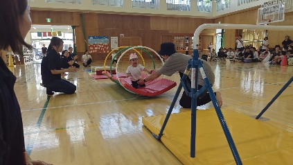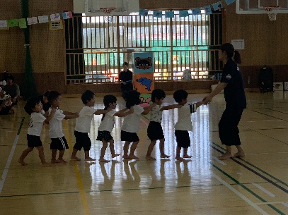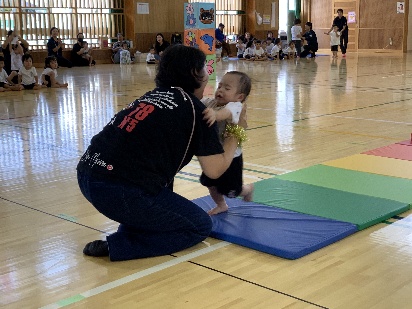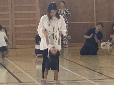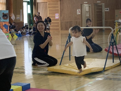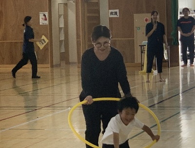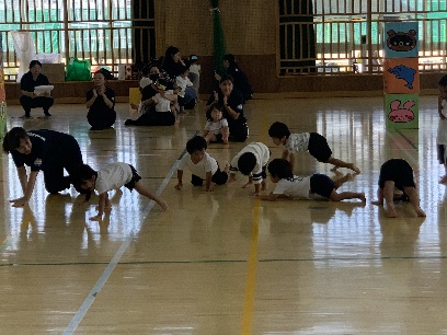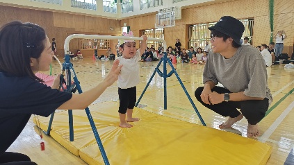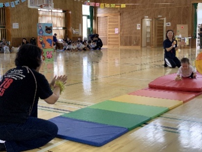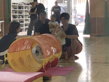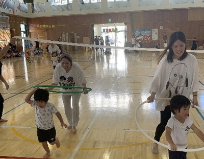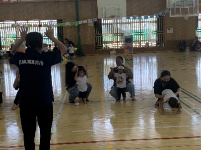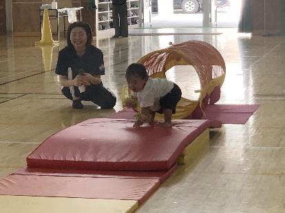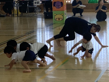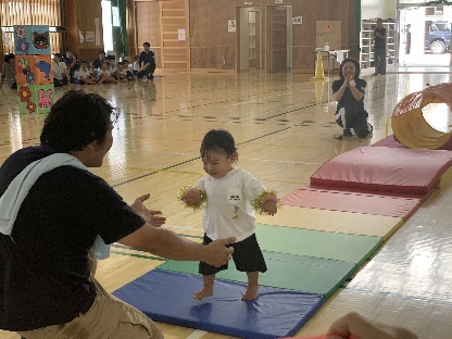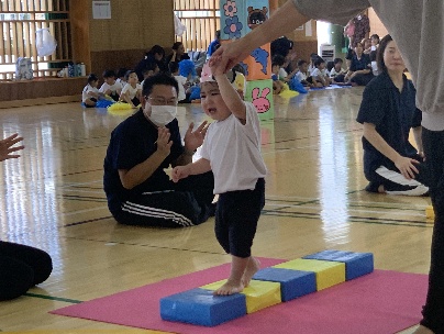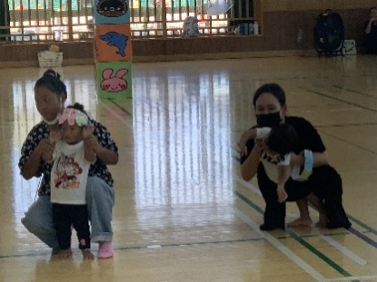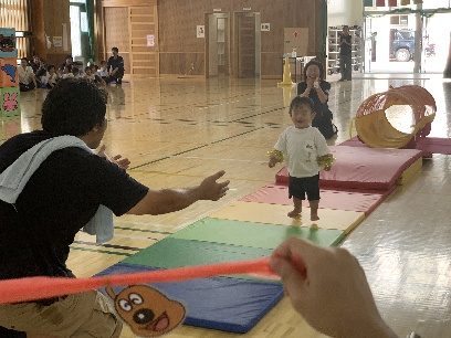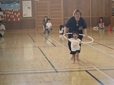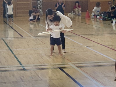 保護者と元気よく、ザウルスドッカーンの踊りをしました。そのあと、お母さんの足に乗って歩いたり、フラフープを使ってゴールまで走りました。
