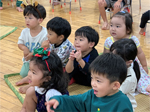 令和7年12月24日(水)今日は、サンタさんを招いてのクリスマスおたのしみ会をしました。サンタさんへの質問コーナーの後は、プレゼントをもらい、大好きなサンタさんと一緒に記念撮影!!「サンタさん来て良かったね♪」「楽しかったね!」と嬉しそうに話をする子ども達でした!
